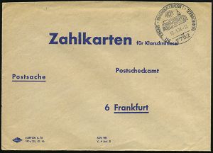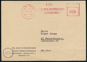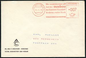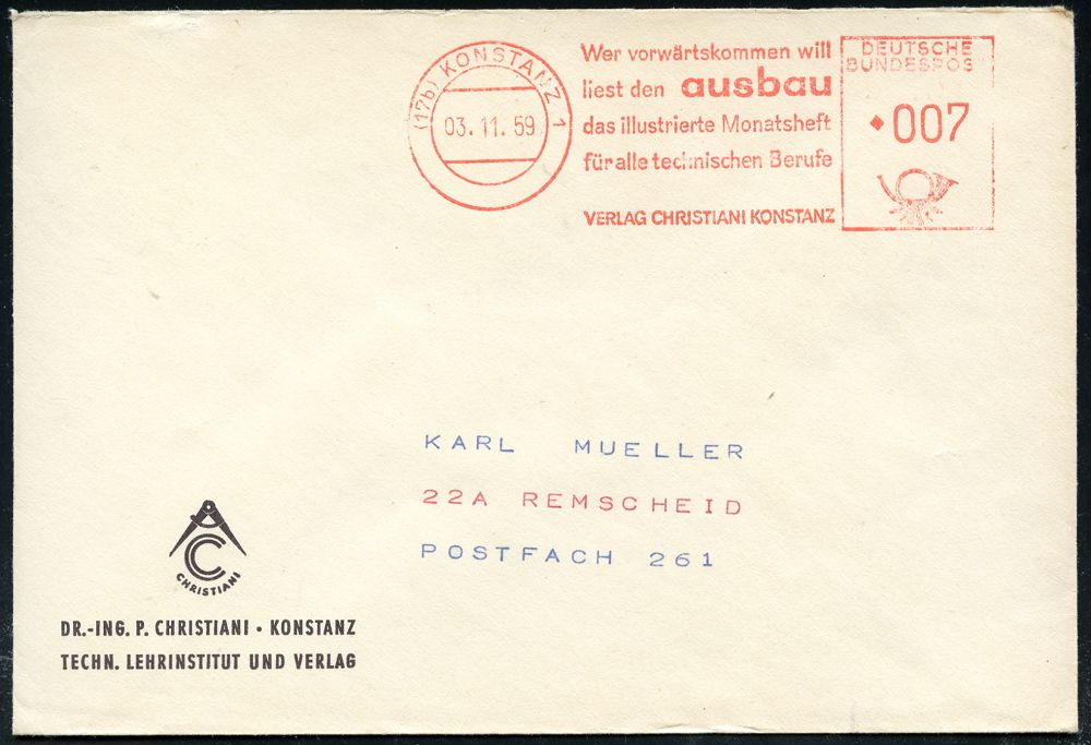 5468 | 12 € | POSTLEITRAUM 7700 (OHNE SINGEN) : (17b) KONSTANZ 1/ Wer vorwärtskommen will/ liest den ausbau../ VERLAG CHRISTIANI.. 1959 (3.11.) AFS Francotyp auf Firmen-Bf.: DR.-ING. P. CHRISTIANI.. TECHN. LEHRINSTITUT U. VERLAG (Dü.E-23DO mit seltenem 2K-Orts-Stpl.!) | ![]() | |