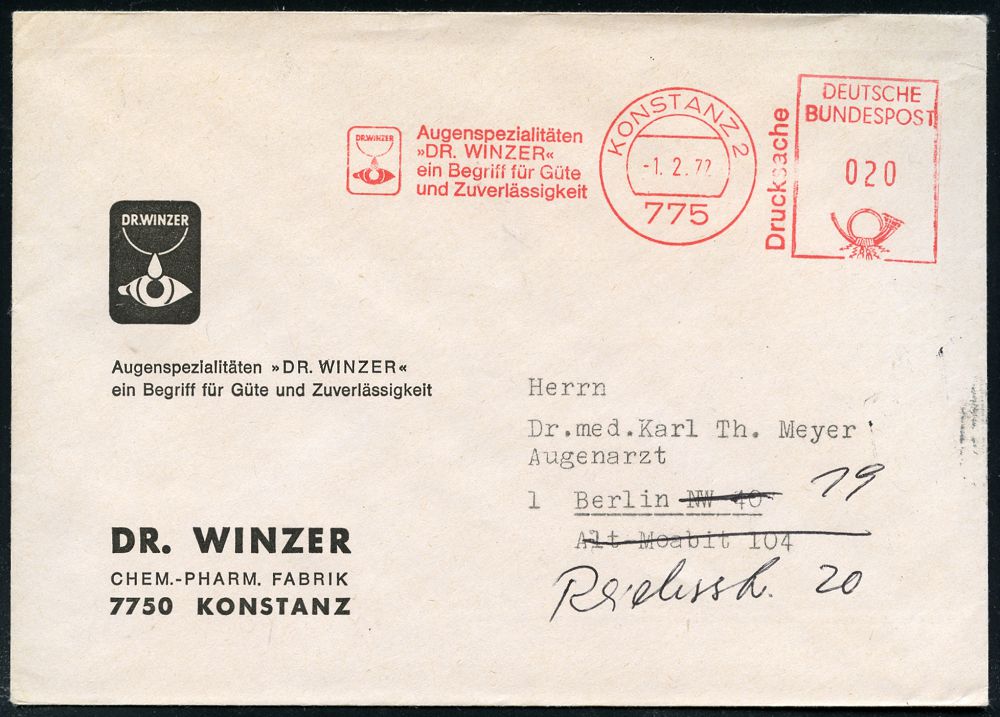 5470 | 12 € | POSTLEITRAUM 7700 (OHNE SINGEN) : 775 KONSTANZ 2/ Augenspezialitäten/ "DR.WINZER".. 1972 (1.2.) AFS Postalia mit Zusatz "Drucksache" (Firmenlogo: Auge) nachgesandter motivgl. Firmen-Bf. n. West-Berlin (Dü.E-26 B) | ![]() | |