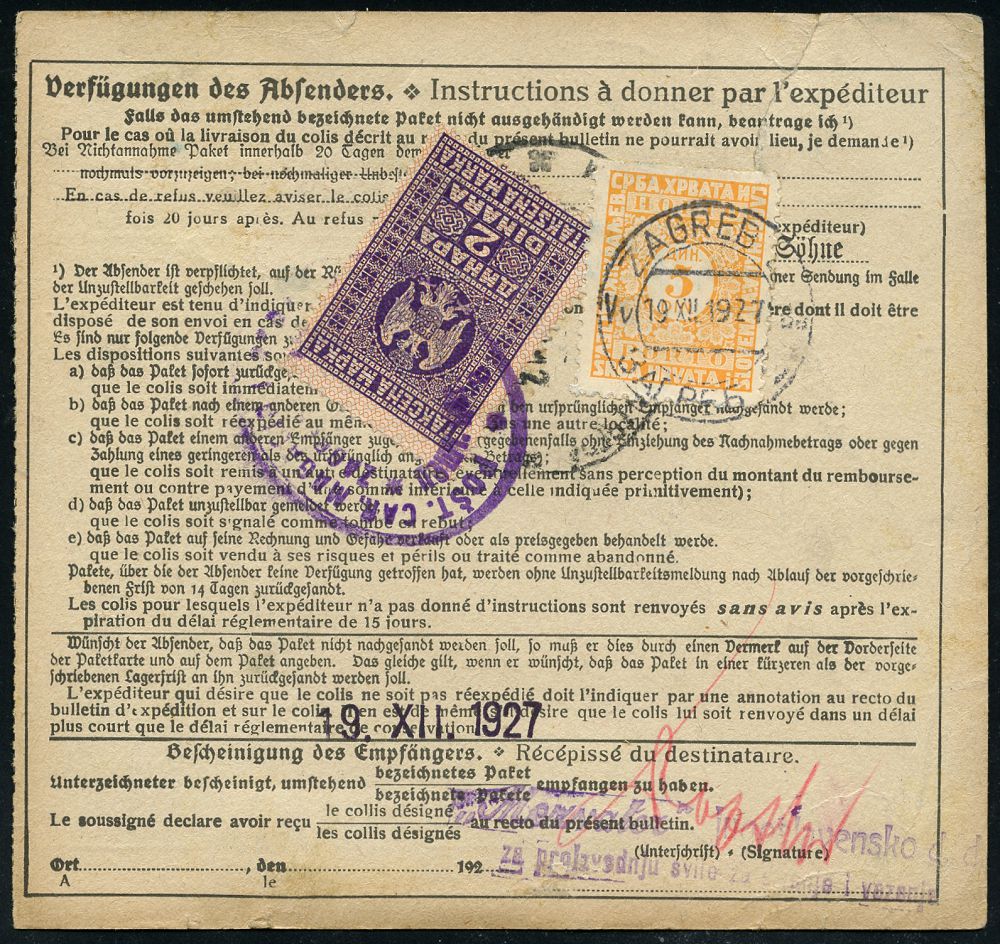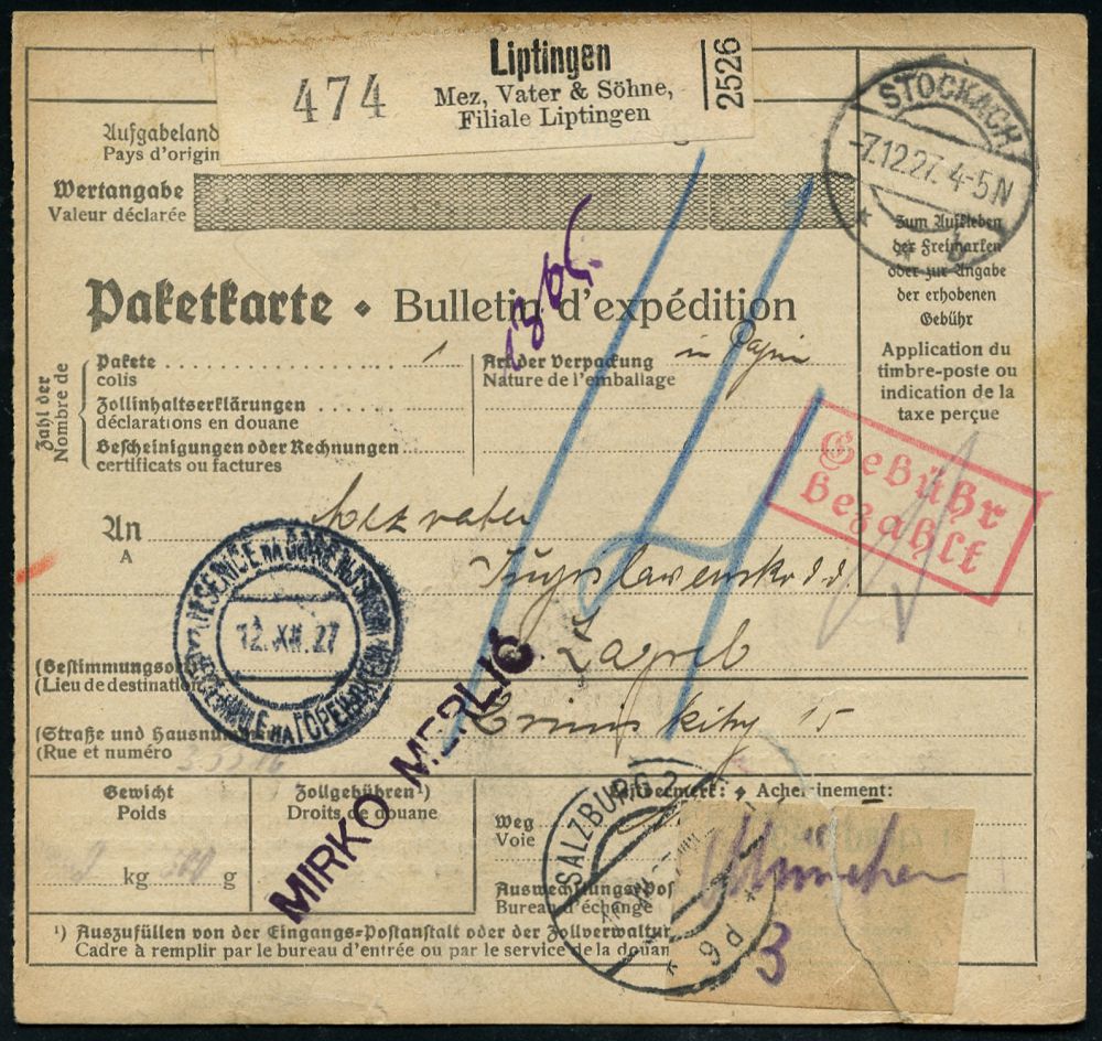 5472 | 30 € | POSTLEITRAUM 7700 (OHNE SINGEN) : Liptingen 1927 (7.12.) 1K-Brücke: STOCKACH/**b + schw. Selbstbucher-Paketzettel: Liptingen/ Mez. Vater & Söhne/ Filiale Liptingen + roter Ra.: Gebühr/ Bezahlt + provis- Leitzette: München 3, Ausl.-Selbstbucher-Paket-Kt. n. Zagreb, rs. jugoslaw. Tax- u. Fiskalmarken | ![]() ![]() | |