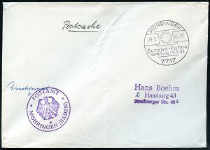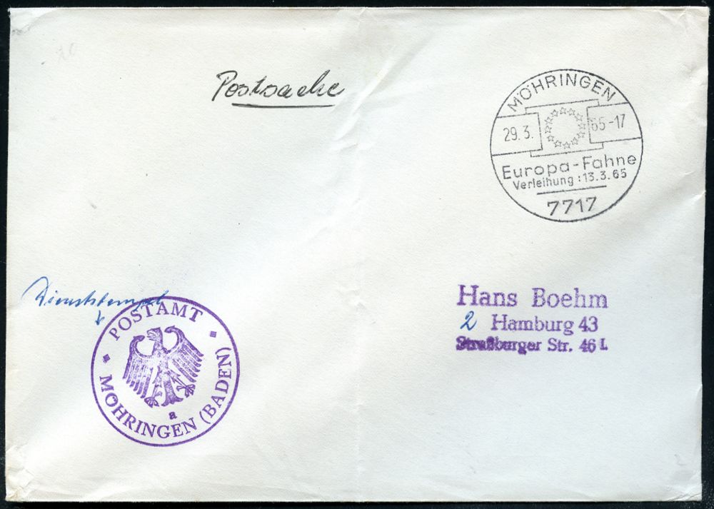 5483 | 8 € | POSTLEITRAUM 7700 (OHNE SINGEN) : 7717 MÖHRINGEN/ Europa-Fahne/ Verleihung 13.3.65 1965 (29.3.) SSt (Europa-Flagge) + viol. 1K-HdN: POSTAMT/a/MÖHRINGEN (BADEN) , Postdienst-Antwort-Bf. (daher gefaltet) n. Hambg. (Bo.2) | ![]() | |