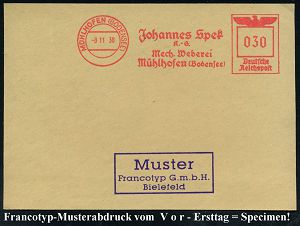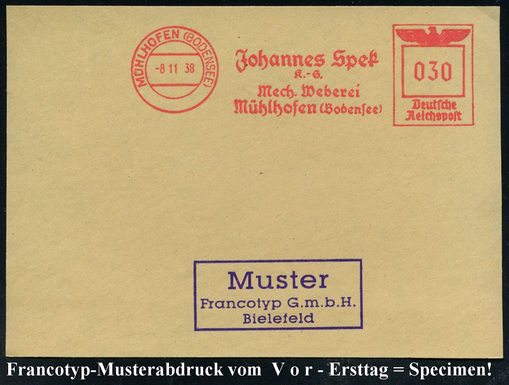 5484 | 35 € | POSTLEITRAUM 7700 (OHNE SINGEN) : MÜHLHOFEN (BODENSEE)/ Johannes Spek/ K.G./ Mech.Weberei.. 1939 (8.11.) AFS-Musterabdruck Francotyp "Reichsadler" , glasklar gest. Francotyp-Musterblatt vom V o r - Ersttag ! (mit Attest), selten! (Dü.E-5CGo) | ![]() ![]() | |