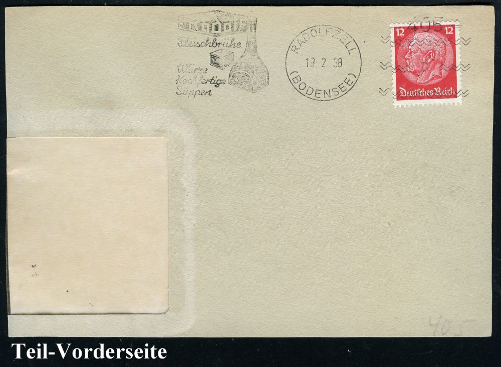 5487 | 25 € | POSTLEITRAUM 7700 (OHNE SINGEN) : RADOLFZELL/ (BODENSEE)/ =405=/ Kadolf/ Fleischbrühe/ Würze../ Suppen 1938 (19.2.) Freimarkenstempel auf EF 12 Pf. Hindenbg. = Vorausentwertung durch Frankierautomat mit Kennung (der Fa. Telefonbau & Normalzeit) Abb.: Würzflasche, Brühwürfel, Teil-Vorderseite, selten! | ![]() | |