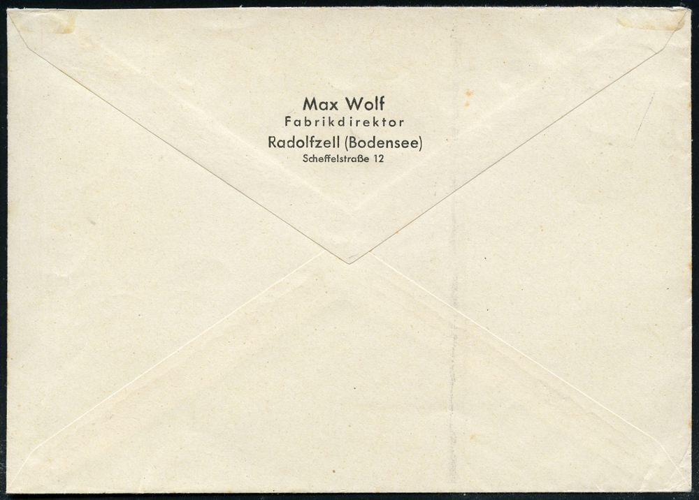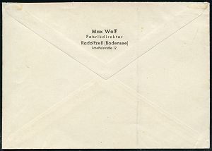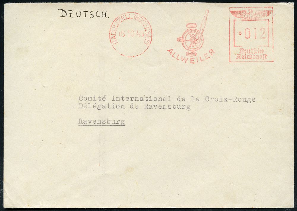 5489 | 28 € | POSTLEITRAUM 7700 (OHNE SINGEN) : RADOLFZELL (BODENSEE)/ ALLWEILER 1946 (16.10.) aptierter AFS Francotyp "Reichsadler" unverändert weiterverwendet = Notmaßnahme! (Hand-Pumpe) etw. hell, zeitbedingt!, rs. Abs.-Vordruck: Max Wol, Fabrikdirektor.., Fern-Bf., vergl. Kat.-Nr.5490 (Dü.E-5DG, unverändert, nur wenige Monate !) | ![]() ![]() | |