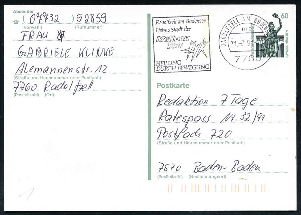 5496 | 5 € | POSTLEITRAUM 7700 (OHNE SINGEN) : 7760 RADOLFZELL AM BODENSEE/ me/ ..Heimat der/ Mettnau/ Kur.. 1991 (31.1.) MWSt (3 stilis. Turner) Bedarfs-Kt. | ![]() | |