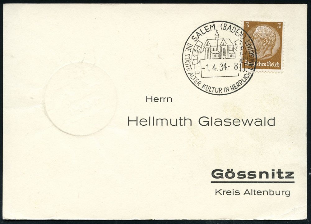5498 | 16 € | POSTLEITRAUM 7700 (OHNE SINGEN) : SALEM (BADEN)/ DIE STÄTTE ALTER KULTUR IN HERRLICHER LANDSCHAFT 1934 (1.4.) HWSt (got. Salemer Münster des ehem. Zisterzienser-Klosters, 1137) klar gest. Inl.-Karte (Bo.1, nur 1934-35 verwendet) | ![]() | |