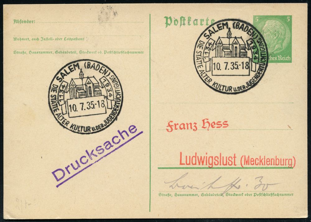 5499 | 15 € | POSTLEITRAUM 7700 (OHNE SINGEN) : SALEM (BADEN)/ DIE STÄTTE ALTER KULTUR U.DER JUGENDERTÜCHTIGUNG 1937 (10.7.) HWSt (got. Salemer Münster des ehem. Zisterzienser-Klosters, 1137) klar gest. Inl.-Karte (Bo.2, nur 1935-37 verwendet) | ![]() | |