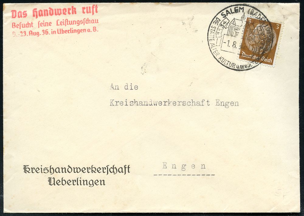 5500 | 20 € | POSTLEITRAUM 7700 (OHNE SINGEN) : SALEM (BADEN)/ DIE STÄTTE ALTER KULTUR U.DER JUGENDERTÜCHTIGUNG 1936 (1.8.) HWSt = got. Kirche des ehem. Zisterzienser-Klosters + roter HdN: Das Handwerk ruft/ Besucht seine Leistungsschau.. , Vordruck-Bf.: Kreishandwerkerschaft Ueberlingen, seltener Beleg (Dü.2, nur 1935-37) | ![]() | |