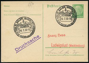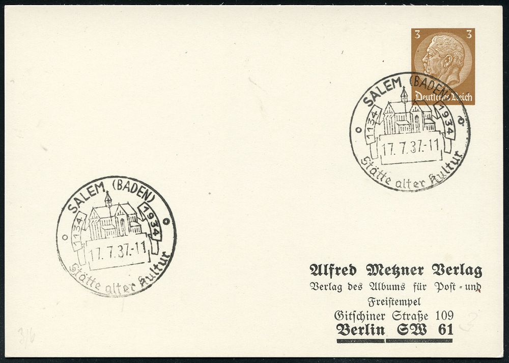 5501 | 18 € | POSTLEITRAUM 7700 (OHNE SINGEN) : SALEM (BADEN)/ Stätte alter Kultur 1937 (17.7.) HWSt = got. Kirche des ehem. Zisterzienser-Klosters auf PP 3 Pf. Hindenbg, braun: Alfred Metzner Verlag.. (Mi.PP122/B 9) n. Berlin (Bo.3, Erstjahr) | ![]() | |