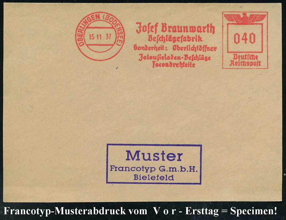 5524 | 35 € | POSTLEITRAUM 7700 (OHNE SINGEN) : ÜBERLINGEN (BODENSEE)/ Josef Braunwarth/ Beschlägefabrik../ Facondrehteile 1937 (15.11.) AFS-Musterabdruck Francotyp "Reichsadler" , glasklar gest. Francotyp-Musterblatt vom V o r - Ersttag ! (mit Attest), selten! (Dü.E-5CGo) | ![]() ![]() | |