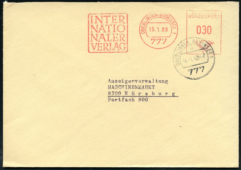 5530 | 10 € | POSTLEITRAUM 7700 (OHNE SINGEN) : 777 ÜBERLINGEN 1/ INTRER/ NATIO/ NALER/ VERLAG 1969 (15.1.) AFS Francotyp + 1K-Segment: 777 ÜBERLINGEN 1/u vom 16.1. = Datumskorrektur bei falscher Datumsangabe im Freistempel! , Fern-Bf. (Dü.26) | ![]() | |