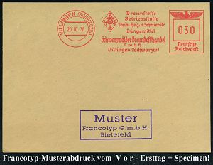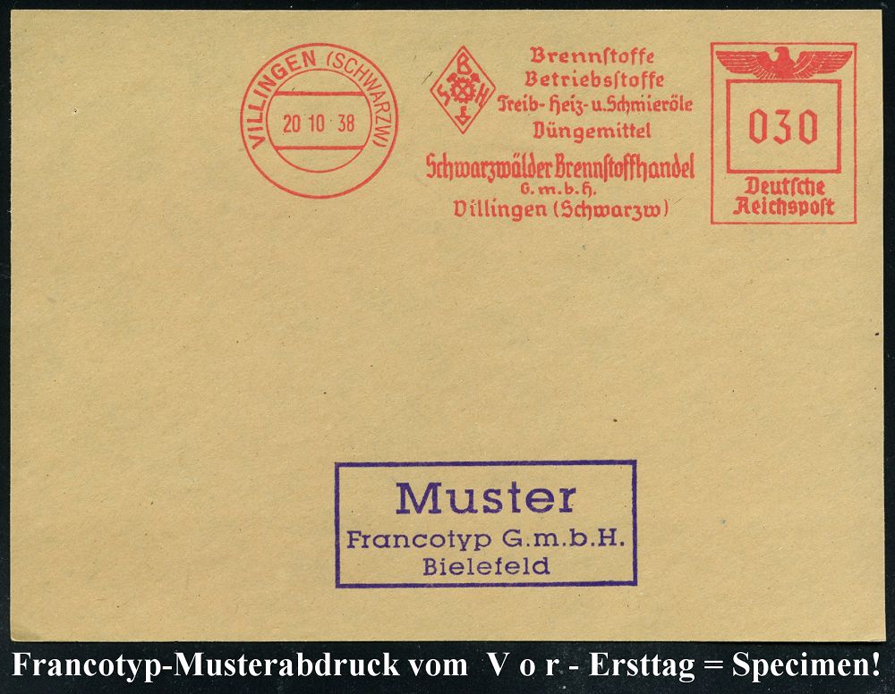 5539 | 35 € | POSTLEITRAUM 7700 (OHNE SINGEN) : VILLINGEN (SCHWARZW)/ Brennstoffe/ Betriebsstoffe/ ..Düngemittel/ Schwarzwälder Brennstoffhandel.. 1938 (20.10.) AFS-Musterabdruck Francotyp "Reichsadler" (Firmen-Logo) glasklar gest. Francotyp-Musterblatt vom V o r - Ersttag ! (mit Attest), selten! (Dü.E-5CGo) | ![]() ![]() | |