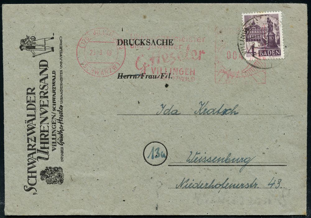 5542 | 25 € | POSTLEITRAUM 7700 (OHNE SINGEN) : (17b) VILLINGEN/ (SCHWARZW)/ ..Heseler/ VILLINGEN 1949 (22.3.) AFS Postalia "Gr. Posthorn" + Nach-Frankatur 4 Pf. Baden (Mi.29) Illustrierter Firmen-Bf.: SCHWARZWÄLDER UHRENVERSAND.. Günter Heseler.. (Wappen u. wandernder Uhrenhändler) Inl.-Drs.-Bf. (Dü.E-22 B) | ![]() | |