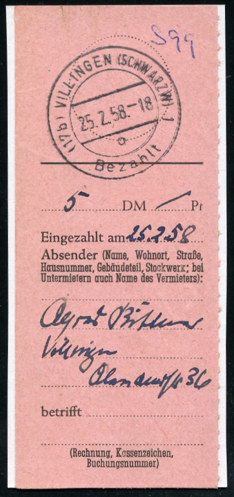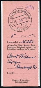 5544 | 16 € | POSTLEITRAUM 7700 (OHNE SINGEN) : (17b) VILLINGEN (SCHWARZW) 1/ Bezahlt 1958 (25.2.) schwarzer 2K-Steg-PFS mit Uhrzeit auf rosa Postanweisungs-Abschnitt, seltene Verwendung! (Dü.A-7, Nr.32 b, schwarz) | ![]() | |
