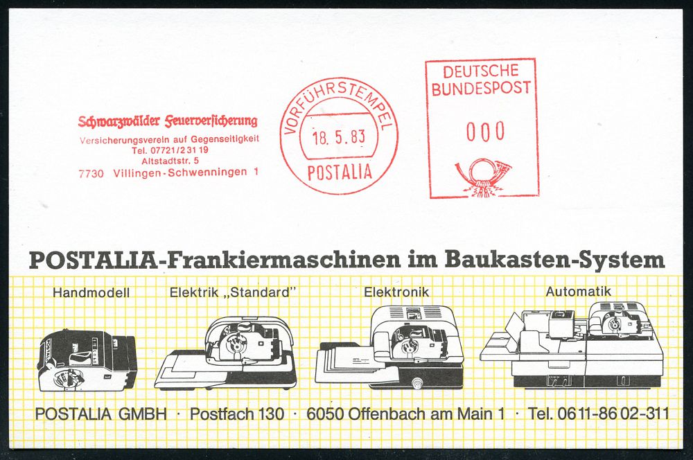 5547 | 18 € | POSTLEITRAUM 7700 (OHNE SINGEN) : 7730 Villingen-Schwenningen 1 1983 (18.5.) AFS.: VORFÜHRSTEMPEL/POSTALIA/ Schwarzwälder Feuerversicherung.. , seltene Postalia-Muster-Kt. (= Specimen) | ![]() | |