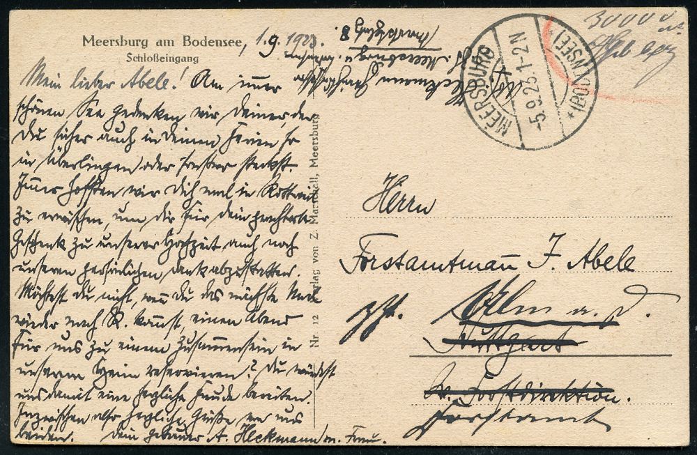 5473 | 14 € | POSTLEITRAUM 7700 (OHNE SINGEN) : MEERSBURG/ *(BODENSEE)* 1923 (5.9.) 1K-Brücke + hs. Barvermerk "3000 M. Gebühr bezahlt" , Infla-Foto-Ak.: Schloßeingang nachgesandt n. Ulm | ![]() ![]() | |