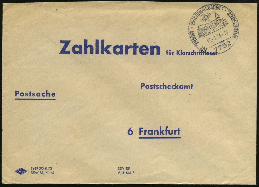 5497 | 16 € | POSTLEITRAUM 7700 (OHNE SINGEN) : 7752 REICHENAU/ INSEL IM BODENSEE 1976 (16.1.) HWSt (Schloßkirche/Schloß) a. selt. PSch-Innendienst-Bf. "Zahlkarten für Klarsschriftleser" (grauweiß/ blau) für Zahlkartenaustausch!, = Postautomation!, seltene Verwendung! (Bo.2 Ty.I) | ![]() | |