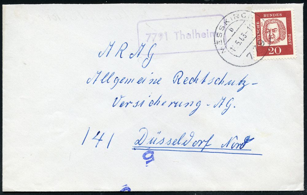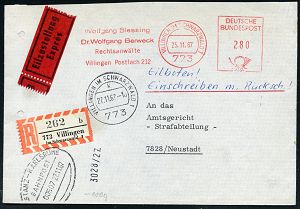 5545 | 40 € | POSTLEITRAUM 7700 (OHNE SINGEN) : 773 VILLINGEN IM SCHWARZWALD 1/ Wolfgang Blessing/ Dr.Wolfgang Berweck/ Rechtsanwälte.. 1967 (25.11.) AFS Postalia 280 Pf. + RZ: 773 Villingen/ im Schwarzwald 1/b + 1K-Segment: 773 VILLINGEN IM SCHWARZWALD 1/b (vom 27.11.) + schw. Eil-1L + Bahn-Oval: KONSTANZ - KARLSRUHE/ BAHNPOST (ZUG) 00507 (nicht ganz voll) Fern-Eil-Einschreiben "Rückschein" = sehr seltene Portostufe!, Götz: L P ! (Dü.E-26 B) | ![]() | |