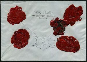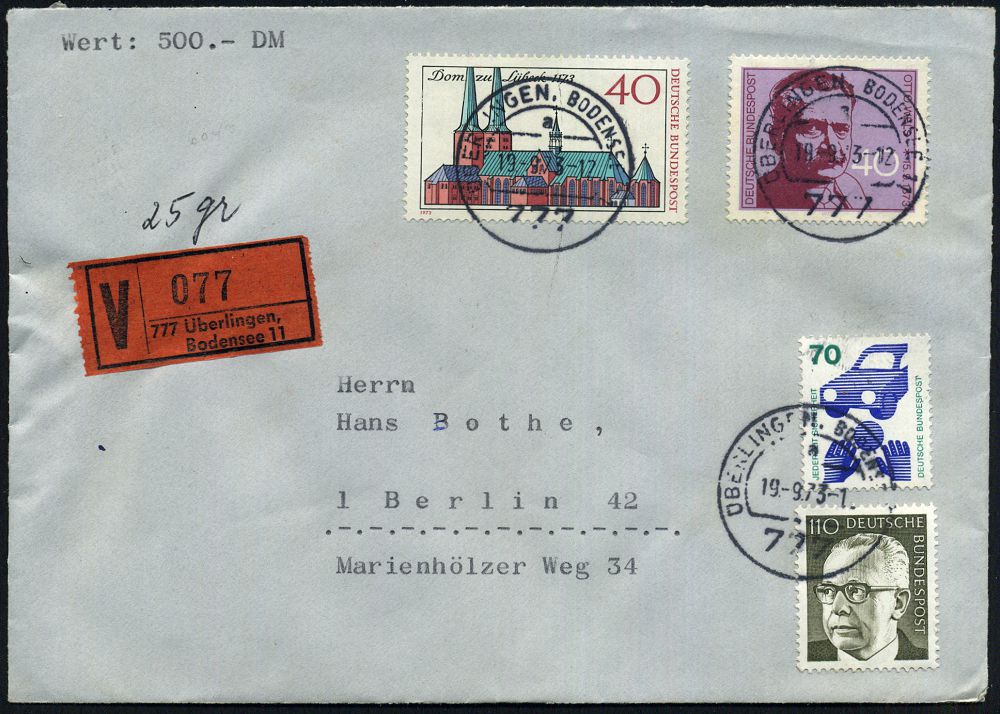 5531 | 20 € | POSTLEITRAUM 7700 (OHNE SINGEN) : 777 ÜBERLINGEN,BODENSEE 11/ a 1973 (19.9.) 1K-Segment 3x auf 260 Pf.-Frankatur + orangeroter VZ: 777 Überlingen,/Bodensee 11 (= Burgberg) gesiegelter Fern-Wert-Bf. 500.- DM n. West-Berlin | ![]() ![]() | |