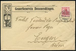 5378 | 20 € | POSTLEITRAUM 7700 (OHNE SINGEN) : DONAUESCHINGEN/ **b 1909 (14.11.) 1K-Gitter auf Reklame-Bf.: Gewerbeverein Donaueschingen = Merkur- u. Gewerbe-Symbolik, dekorativer Inl.-Bf. (Mi.86 I) | ![]() | |