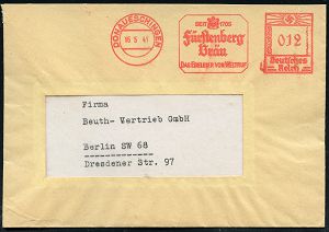 5380 | 18 € | POSTLEITRAUM 7700 (OHNE SINGEN) : DONAUESCHINGEN/ SEIT 1705/ Fürstenberg/ Bräu/ DAS EDELBIER.. 1941 (16.5.) AFS Francotyp "Hakenkreuz" (Wappenlogo) Fern-Bf. (E-3CEo) | ![]() | |