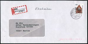 5389 | 14 € | POSTLEITRAUM 7700 (OHNE SINGEN) : 78120 FURTWANGEN IM SCHWARZWALD 1/ c 1995 (22.5.) 1K-Segment auf EF 450 Pf. Neubrandenbg. + neuer Selbstklebe-RZ: 78120 Furtwangen/im Schw. 1 (nur kurze Verwendungszeit) Inl.-R-Bf. (Mi.1623 EF + 10.-EUR) | ![]() | |