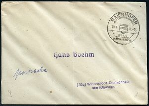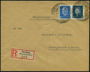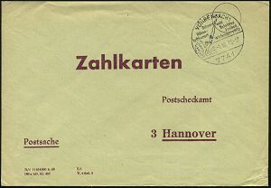 5408 | 30 € | POSTLEITRAUM 7700 (OHNE SINGEN) : HORNBERG (SCHWARZWALDBAHN)/ SBIK-GERÄTE-QUALITÄT/ SCHIELE INDUSTRIEWERKE 1946 (4.7.) aptierter AFS Francotyp "Hakenkreuz" = entfernt + Inschrift "Deutsches Reich" = Notmaßnahme! (Firmen-Logo) rs. motivgl. Abs.-Vordruck, seltener Fern-Bf., vergl. Kat.-Nr. 5405, 5408-10 (Dü.E-12 AE-98o = seltene Type) | ![]() ![]() | |