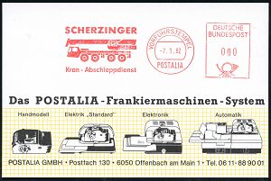 5418 | 18 € | POSTLEITRAUM 7700 (OHNE SINGEN) : Hüfingen 1982 (7.1.) AFS.: VORFÜHRSTEMPEL/POSTALIA/SCHERZINGER/Kran-Abschleppdienst = schwerer Kran-LKW (Faun) seltene Postalia-Muster-Kt. (Dü.E-26B = Specimen) | ![]() | |