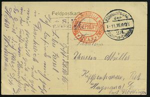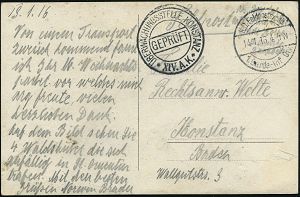 5428 | 16 € | POSTLEITRAUM 7700 (OHNE SINGEN) : Konstanz 1916 (1.11.) 1K-Brücke: K.D.Feldpostexped./d./28./Reserve-Division + roter Zensur-2K-Steg: ÜBERWACHUNGS-STELLE KONSTANZ/ GEPRÜFT/ XIV.A.K. (Rie.4) klar gest. Feldp.-Zensur-Ak: Fort Douaumont! n. Überlingen (Kat.Nr.1192) | ![]() ![]() | |