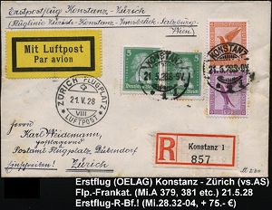 5430 | 35 € | POSTLEITRAUM 7700 (OHNE SINGEN) : KONSTANZ/ *1i 1928 (21.5.) 1K-Gitter 2x auf 15 Pf. u. 50 Pf. Adler, Flugpost u.a. zum Erstflug der OELAG: Konstanz - Zürich (vs. AS: ZÜRICH FLUGPLATZ..) + RZ: Konstanz 1 Pf., 15 Pf. u. 50 Pf. Adler (Mi.A 379, 381 u.a.,+ 23.-EUR, gering stockig), seltener Erstflug-R-Bf.! (Mi.28/32-04, + 75.- EUR) | ![]() | |