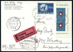 5449 | 18 € | POSTLEITRAUM 7700 (OHNE SINGEN) : 775 KONSTANZ 1/ at 1971 (11.3.) 1K-Segment als AS + Bahn-Oval: KONSTANZ - KARLSRUHE/BAHNPOST/ ZUG 16920/ g j , schweizer Frankatr mit 1K: 6000 LUZERN/PTT/ WERTZEICHEN , klar gest. Ausl.-Eil-Karte n. Konstanz (Mi.Paar 946, 964) | ![]() | |