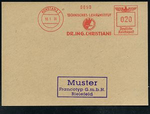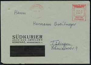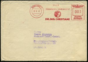 5456 | 20 € | POSTLEITRAUM 7700 (OHNE SINGEN) : KONSTANZ 1/ TECHNISCHES LEHRINSTITUT/ DR.ING.CHRISTIANI 1941 (22.9.) AFS Francotyp "Reichsadler" (Firmen-Logo = Adler u. Buch) Inl.-Bf. , (Dü.E-5CGh) | ![]() | |
