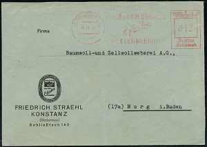 5457 | 25 € | POSTLEITRAUM 7700 (OHNE SINGEN) : KONSTANZ 1/ FRIEDRICH STRAEHL/ Efeska/ WETTERKLEIDUNG 1945 (15.11.) AFS Francotyp "Reichsadler" unveränder weiterverwendet = Notmaßnahme! , dekorativer Firmen-Bf. (schwache Mittelfalte) n. Murg (Dü.E-5CGo unverändert) | ![]() | |