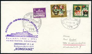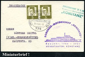 5445 | 18 € | POSTLEITRAUM 7700 (OHNE SINGEN) : 775 KONSTANZ 1/ DB/ Jungfernfahrt MS.Konstanz 1964 (27.5.) SSt + viol. HdN: BODENSEE-MOTORSCHIFF "KONSTANZ" + grüner 3L: JUNGFERNFAHRT 27.5.64.., kleiner, dekorativer Miniatur-Bf (Bo.29) | ![]() | |