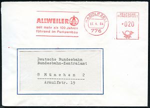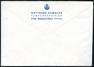 5493 | 12 € | POSTLEITRAUM 7700 (OHNE SINGEN) : 776 RADOLFZELL/ ALLWEILER/ seit mehr als 100 Jahren/ ..Pumpenbau 1964 (17.4.) AFS Francotyp (Monogr.-Logo) rs. motivgl. Abs.-Vordruck, Fern-Bf. (Dü.E-26) | ![]() ![]() | |