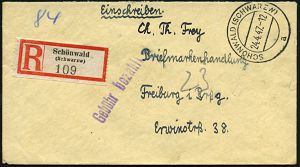 5514 | 15 € | POSTLEITRAUM 7700 (OHNE SINGEN) : SCHÖNWALD (SCHWARZW)/ a 1947 (24.4.) 2K-Steg + viol. 1L: Gebühr bezahlt + RZ: Schönwald/(Schwarzw) , kleiner, dekorativer Fern-R-Bf. | ![]() | |