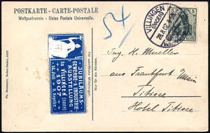 5535 | 50 € | POSTLEITRAUM 7700 (OHNE SINGEN) : VILLINGEN/ (BADEN)/ Gewerbe-/ u./ Industrieausstellung 1907 (28.8.) seltener SSt + blaue Präge-Ausstellungs-Vignette auf zweifarbiger Ausstellungs-Sonder-Kt.: Halle "Die Kunstausstellung", klar gest.! (Bo.1) | ![]() ![]() | |