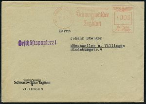 5540 | 20 € | POSTLEITRAUM 7700 (OHNE SINGEN) : VILLINGEN (SCHWARZW)/ Schwarzwälder/ Tagblatt 1942 (17.6.) AFS Francotyp "Reichsadler" 008 Pf. (Hakenkreuz-Adler) motivgl. Firmen-Bf. "Geschäftspapiere" (Dü.E-5DG) | ![]() | |