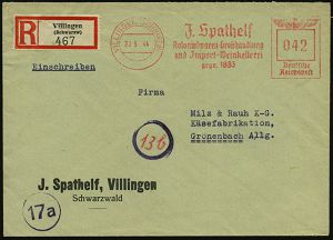 5541 | 25 € | POSTLEITRAUM 7700 (OHNE SINGEN) : VILLINGEN (SCHWARZW)/ J.Spathelf/ Kolonialwaren-Großhandlung/ u.Jmport-Weinkellerei/ gegr.1883 1944 (21.5.) AFS Francotyp "Reichsadler" 042 Pf. + RZ: Villingen / (Schwarzw) , Firmen-Bf. mit zugestempelter PLGZ (17 a), Fern-R-Bf. (Dü.E-5CGo) | ![]() | |