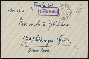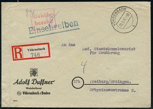 5551 | 16 € | POSTLEITRAUM 7700 (OHNE SINGEN) : VÖHRENBACH/ a 1947 (20.3.) 2K-Steg + roter Ra.2: Gebühr/bezahlt + RZ: Vöhrenbach , klar gest. Firmen-R-Bf.: Adolf Duffner/ Weinkellerei.. n. Freiburg/Br. (Richter Nr.2439) | ![]() | |