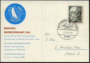5377 | 16 € | POSTLEITRAUM 7700 (OHNE SINGEN) : 7751 DETTINGEN-WALLHAUSEN/ KANU-SEGEL/ WELTMEISTERSCHAFT 1965 (2.8.) SSt (3 Segelboote) klar auf zweifarbiger Sonder-Kt. ICF DKV.. (Bo.1) | ![]() | |