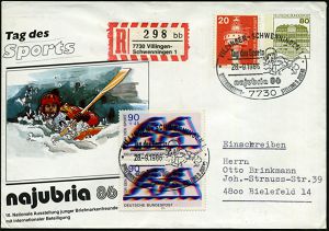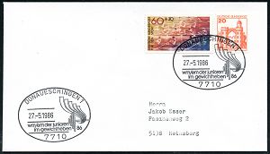 5384 | 6 € | POSTLEITRAUM 7700 (OHNE SINGEN) : 7710 DONAUESCHINGEN 1/ wm-em d. junioren/ im gewichtheben 1986 (27.5.) SSt = Gewicht , klar gest. Inl.-Bf.. mit Sport-Zuschlagsmarke | ![]() | |