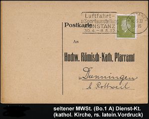 5431 | 20 € | POSTLEITRAUM 7700 (OHNE SINGEN) : KONSTANZ 1/ Luftfahrt-/ u.Sportausstellung 1932 (14.5.) MWSt klar auf Kirchendienst-Kt.: Röm- Kath. Pfarramt (minim.Rißchen) n. Dunningen (Bo.1 A) | ![]() ![]() | |