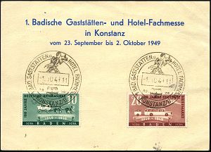 5441 | 30 € | POSTLEITRAUM 7700 (OHNE SINGEN) : KONSTANZ/ B./ 1.BAD.GASTSTÄTTEN u.HOTEL FACHMESSE 1949 (1.10.) SSt = Kellner mit Tablett (u.Teekanne, Flasche, Tasse) 2x rs. auf Sonder-Kt. (Michaelis Nr.5, + 30.-DM, 1991) kompl. Satz "100 Jahre Briefm." (+ 26.-EUR) seltene Ausl.-Karte n. Irland (Bo.16) | ![]() | |