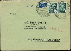 5480 | 16 € | POSTLEITRAUM 7700 (OHNE SINGEN) : MEERSBURG (BODENSEE)/ 650 JAHRE STADT 1949 (13.12.) Jubil.-HWSt (Wappen) 2x auf Paar 10 Pf. Baden H. B. Grien (Mi.33 MeF), klar gest. Firmen-Fernbf. (Bo.4, nur Ende 1949 - 1950 verwendet) | ![]() | |