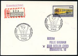 5505 | 20 € | POSTLEITRAUM 7700 (OHNE SINGEN) : 7745 SCHONACH IM SCHWARZWALD/ DEUTSCHE NORDISCHE SKI-JUGENDMEISTERSCHAFTEN 1971 (12.2.) SSt auf EF 1.- DM Berlin (Mi.384 EF) + Sonder-RZ: 7745 Schonach../Deutsche Nordische Ski-/Jugendmeisterschaften (NEZ-Kat. Nr.105) Inl.-R-Karte! (Bo.5) | ![]() | |