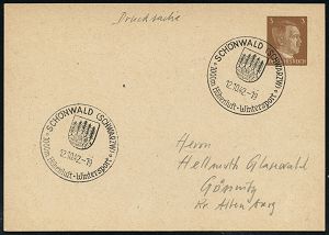5513 | 18 € | POSTLEITRAUM 7700 (OHNE SINGEN) : SCHÖNWALD (SCHWARZW)/ 1000m...Wintersport 1942 (12.10.) HWSt (Stadtwappen = Tannen a.Bergen) auf PP 3 Pf. Hitler, braun, braun (blanco = PP 152 A1-02) klar gest. Fern-Kt.! (Bo.2 Erstjahr) | ![]() | |