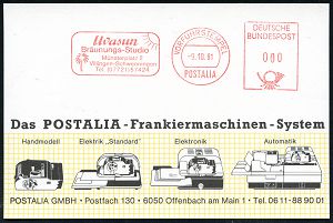 5546 | 18 € | POSTLEITRAUM 7700 (OHNE SINGEN) : Villingen-Schwenningen 1981 (9.10.) AFS: VORFÜHRSTEMPEL/POSTALIA/Wasun/Bräunungs-Studio (Palme/Sonne) seltene Postalia- Musterkt.! (= Specimen) | ![]() | |