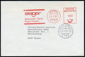 5385 | 10 € | POSTLEITRAUM 7700 (OHNE SINGEN) : 7707 ENGEN/ Geiger/ Chemische Fabrik.. 1982 (22./25.2.) AFS Postalia + 1K-Segment: ENGEN, HEGAU 1/a vom 25.2. (Datumskorrektur des Freistempels) klar gest. Fern-Bf. (Dü.E-26 B) | ![]() | |