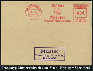 5387 | 35 € | POSTLEITRAUM 7700 (OHNE SINGEN) : FURTWANGEN/ 70 Jahre/ JKS/ Koepfer/ Maschinen-Fräser-Zahnräder 1937 (19.5.) AFs-Musterabdruck (Monogr.-Logo) glasklar gest. Francotyp-Musterblatt vom V o r - Ersttag ! (mit Attest), selten! (Dü.E-5CGo) | ![]() ![]() | |