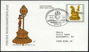 5388 | 12 € | POSTLEITRAUM 7700 (OHNE SINGEN) : 7743 FURTWANGEN IM SCHWARZWALD 1/ 140 JAHRE/ DEUTSCHES UHRENMUSEUM.. 1992 (15.10.) SSt auf passender EF 100 + 50 Pf. Figuren-Uhr mit Tanzbär um 1580 , Bedarfs-FDC-SU. n. Kiel (Mi.1634 EF + 16.- EUR FDC) | ![]() | |